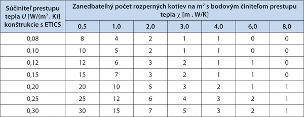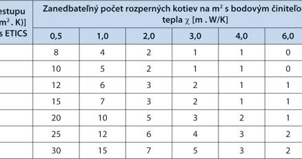 Rozperná kotva s vysokým bodovým činiteľom prestupu tepla χ môže citeľne ovplyvniť celkový výsledný účinok zateplenia pomocou ETICS. Z tohto dôvodu je pri návrhu ETICS nutné poznať bodové súčinitele prestupu tepla χ. Pri znalosti týchto hodnôt sa môže presne vypočítať zníženie tepelného odporu a následne zvýšiť hrúbka tepelnoizolačného materiálu alebo prípadne rozhodnúť o zanedbaní tohto vplyvu (tab. 2).