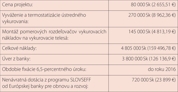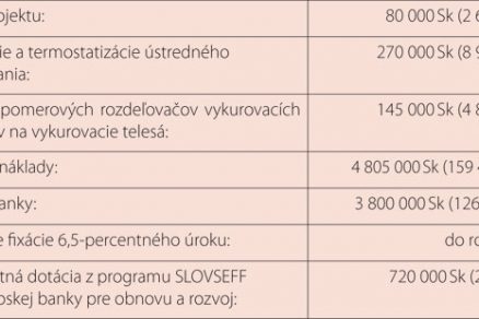 Zlepšovanie tepelnotechnických charakteristík bytových domov je jedinou formou, ako sa obyvatelia bytových domov môžu brániť proti neustále sa zvyšujúcim nákladom na tepelnú energiu. Zateplenie obvodových konštrukcií, hydraulické vyváženie sústavy ústredného kúrenia s termostatickými hlavicami na radiátoroch či montáž pomerových rozdeľovačov vykurovacích nákladov pre jednotlivé byty prinášajú obyvateľom úspory na nákladoch spotreby tepla. „Naša štatistika hovorí približne o 40- až 50-percentných úsporách, pričom reálne môžu byť tieto hodnoty aj vyššie – v závislosti od správania sa obyvateľov bytového domu,“ hovorí Ing. Miloš Ceconík, konateľ spoločnosti Správa domov SBD Bratislava II, s. r. o. Úspora predstavuje pri terajších cenách tepla asi 6- až 9-tisíc Sk (199,16 € až 298,74 €) na priemerný byt za rok. So stúpajúcimi nákladmi na vykurovanie paradoxne stúpa aj výška úspory.