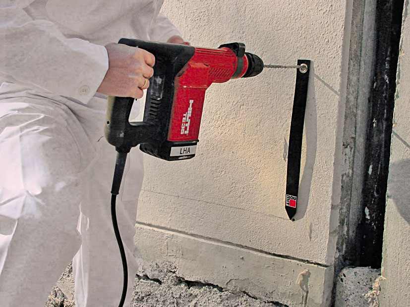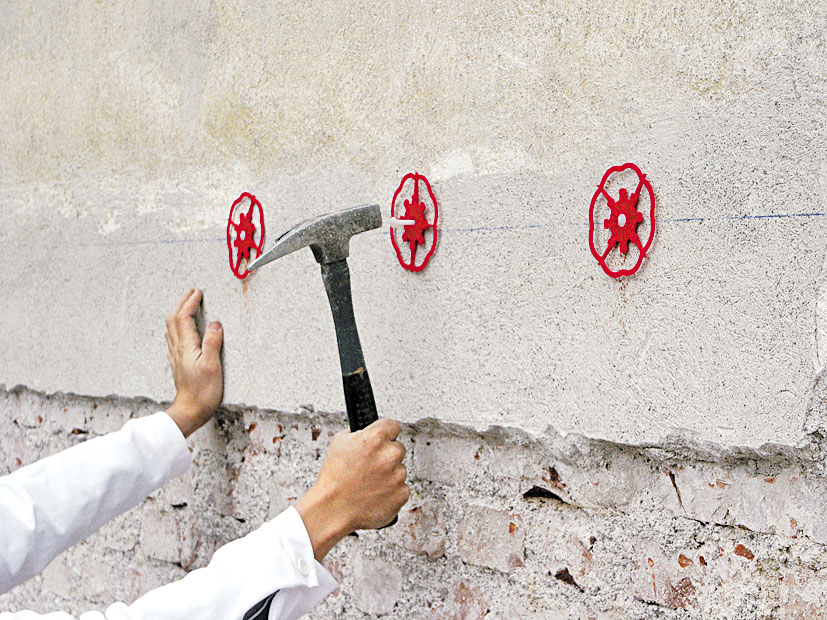 Pomocou značkovacej pomôcky (napr. šnúry zafarbenej hlinkou a olovnice) sa na fasáde vyznačí pravouhlý osadzovací raster s rozmermi max. 400 × 400 mm, 100 mm horizontálne od soklového profilu a vertikálne od hrán budovy okenných a dverných otvorov. V miestach prieniku čiar sa vyvŕtajú otvory. Priemer vrtáka musí zodpovedať priemeru drieku lepiacej kotvy (8 mm).