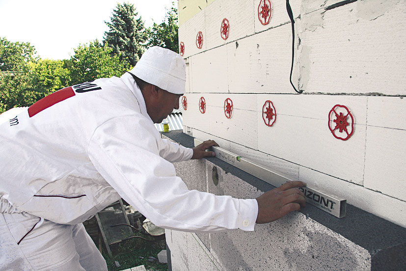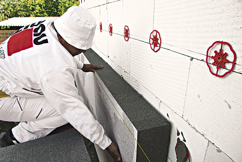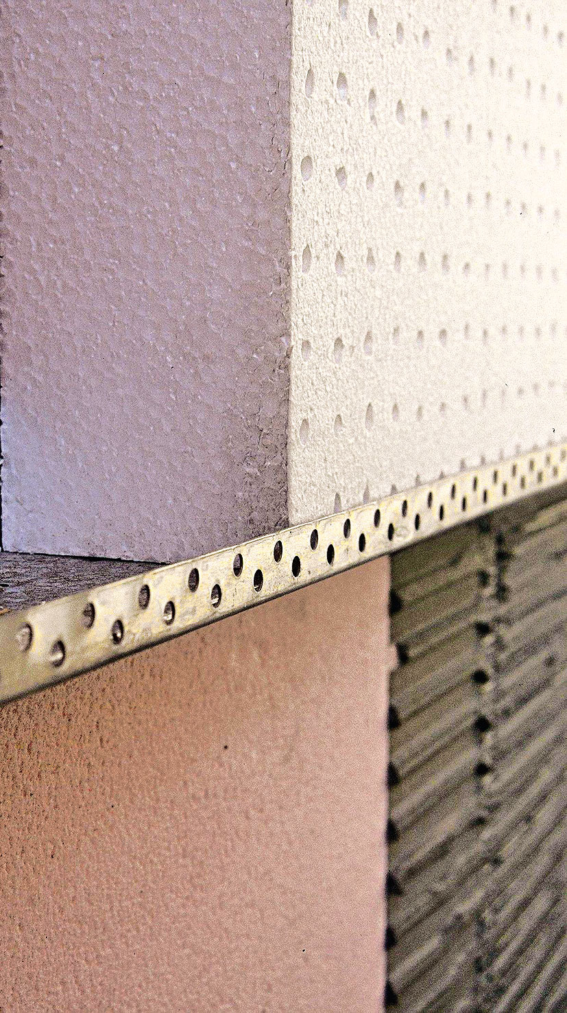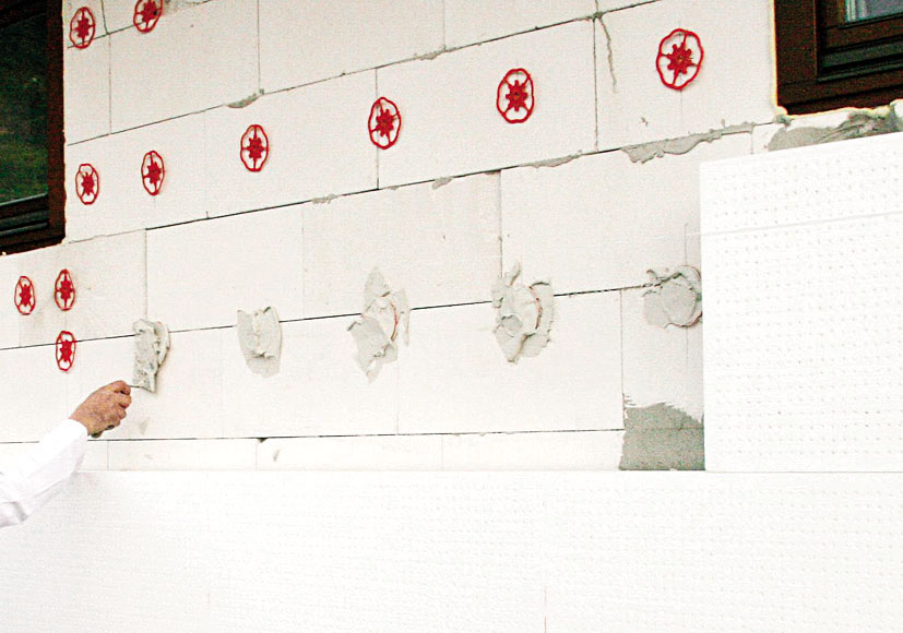 Po nalepení na podklad je potrebné tepelnoizolačné dosky vždy aj dodatočne mechanicky ukotviť rozpernými kotvami (minimálne 3 ks/1 doska). Dosky sa osadzujú od hora dole pritlačením na soklový profil. Výstužná vrstva v soklovej oblasti sa má realizovať maximálne do hĺbky 50 mm pod úroveň terénu (napr. štrkový obsyp).