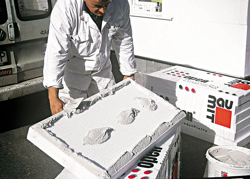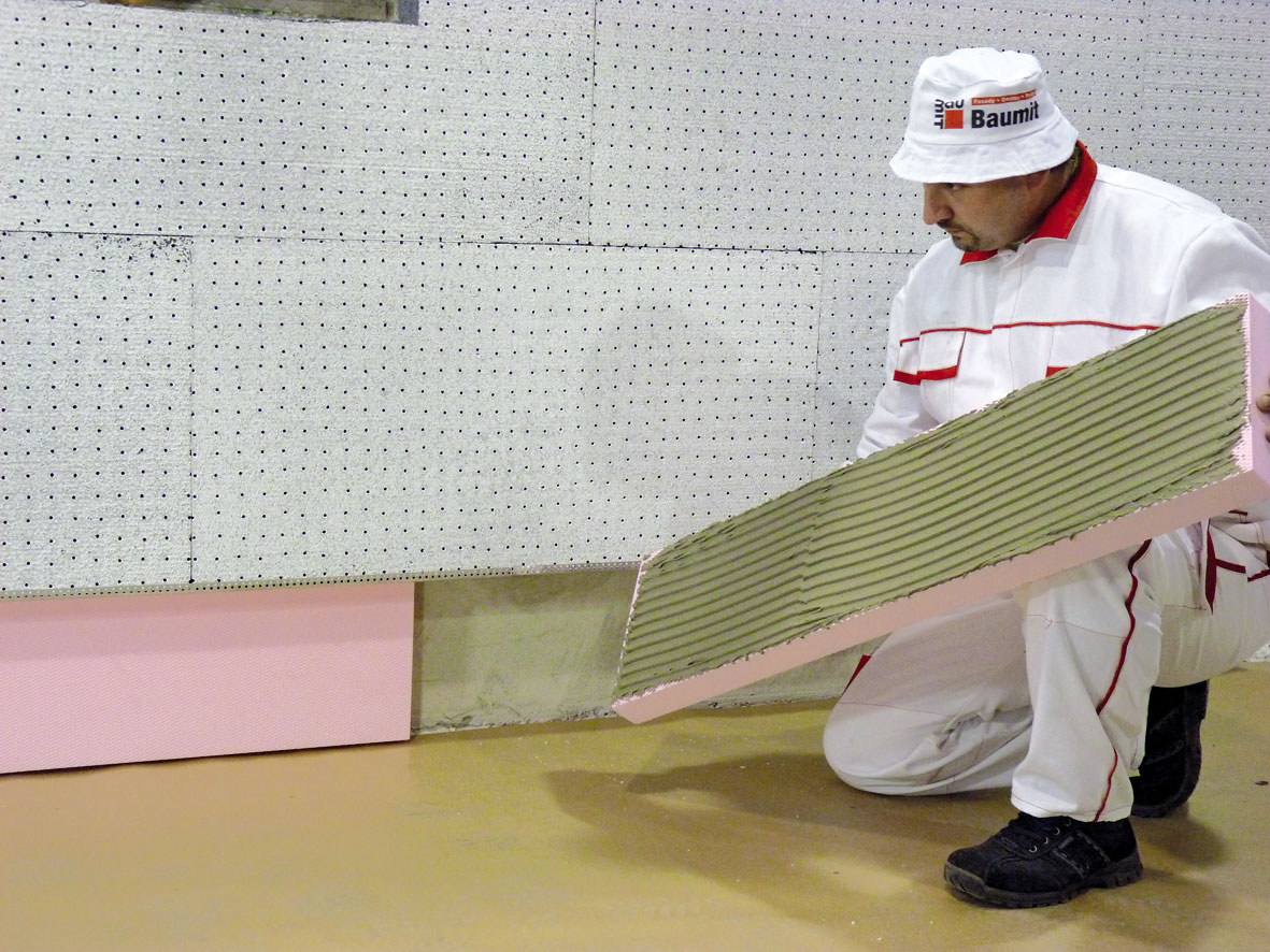 Ak tepelnoizolačný systém siaha až po úroveň terénu, do výšky minimálne 30 cm nad terénom je potrebné použiť dosky na báze extrudovaného polystyrénu s obojstranne zdrsneným povrchom. Lepiaca stierka sa nanáša na soklovú tepelno-izolačnú dosku celoplošne zubovým hladidlom.