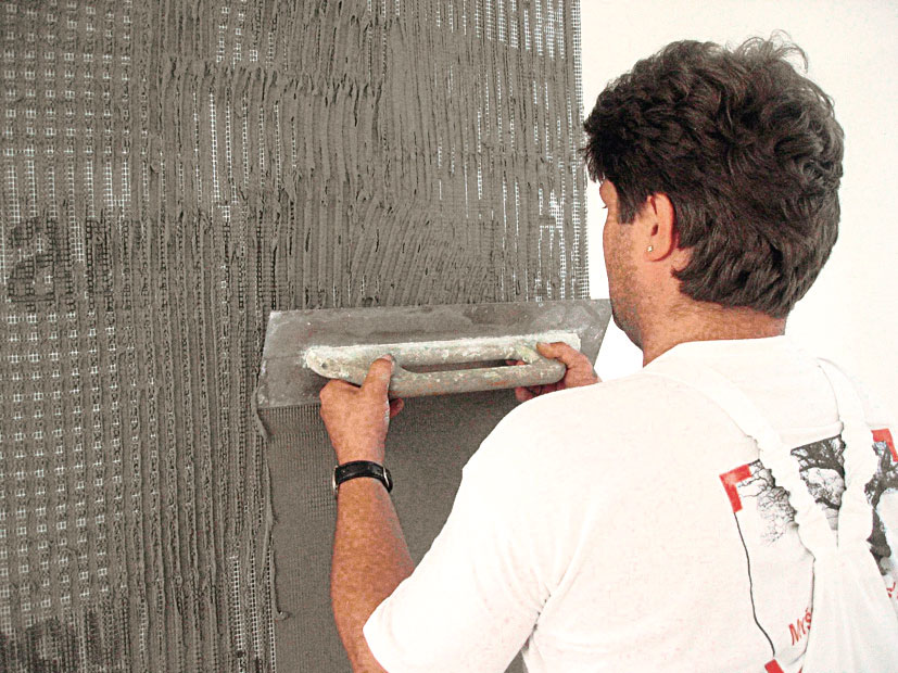 Na tepelnoizolačné dosky sa oceľovým zubovým hladidlom (zub 10 mm) nanesie vrstva stierky. Sklotextilná mriežka sa pomocou hladidla vtlačí do stierky a dôkladne sa zahladí. Jednotlivé kusy mriežky sa kladú s presahom minimálne 100 mm. Po zahladení a stiahnutí prebytočnej stierky má byť hrúbka výstužnej vrstvy minimálne 3 mm (odporúčaná 3 až 6 mm).