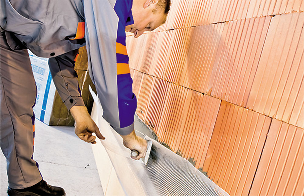 Výstužná mriežka sa vtláča do lepiaceho materiálu naneseného zubovým hladidlom s rozmerom zuba 8 mm alebo 10 mm.