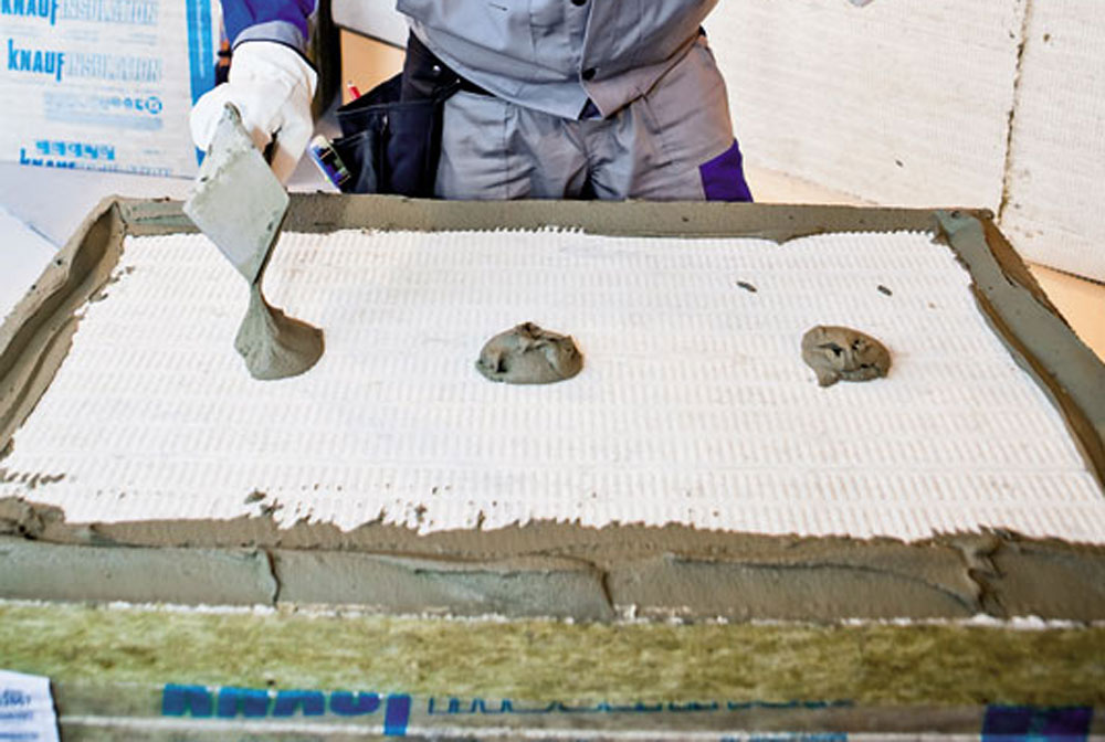 • Dosku s obojstranným nástrekom netreba penetrovať lepidlom pred upevnením ani pred aplikáciou hlavnej armovacej vrstvy. Lepidlo sa na ňu jednoducho nanáša a dobre drží, pretože tenký film zvyšuje priľnavosť lepidla k povrchu dosky a zároveň znižuje jej prašnosť.