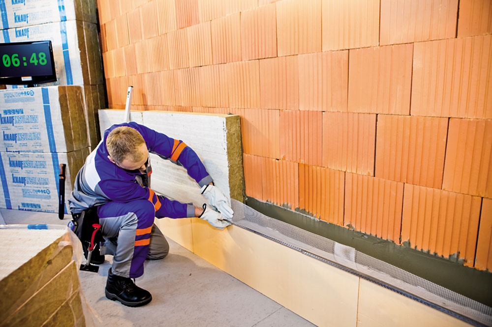 Prvá vrstva izolácie sa aplikuje na zakladaciu lištu, na ktorej je už uložená výstužná mriežka. Táto musí byť na spodnej strane zahnutá.