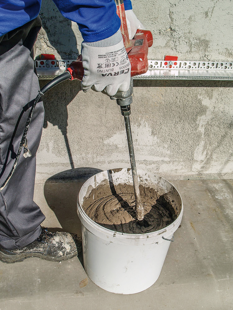 Suchá zmes lepiacej a stierkovacej malty sa vysype do čistej nádoby s predpísaným množstvom vody (6 až 8 l/25 kg vrece) a mieša sa nízkootáčkovým elektrickým miešadlom 3 až 5 minút. Zmes sa nechá 10 minút odstáť.