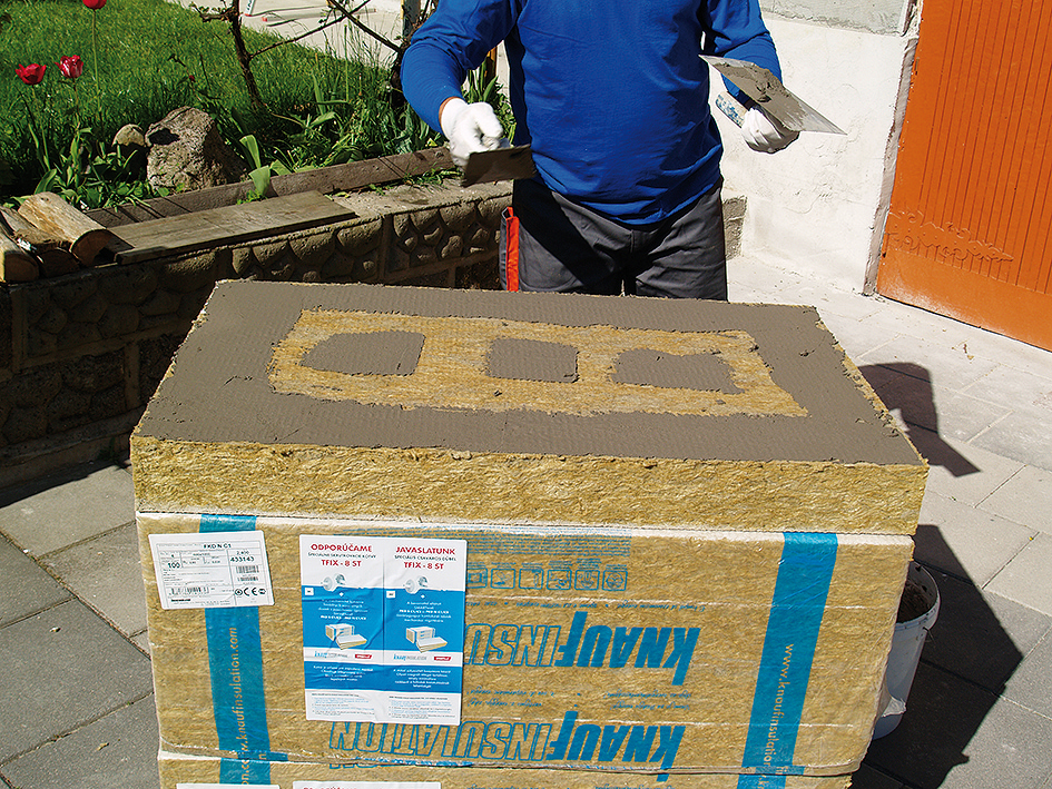 Suchá zmes lepiacej a stierkovacej malty sa vysype do čistej nádoby s predpísaným množstvom vody (6 až 8 l/25 kg vrece) a mieša sa nízkootáčkovým elektrickým miešadlom 3 až 5 minút. Zmes sa nechá 10 minút odstáť. Spracovateľnosť pripravenej lepiacej a stierkovacej malty je 2 hodiny. Prvý rad tepelnoizolačných dosiek sa osadzuje do zakladacích profilov a tesne sa pritlačí na prednú stranu profilov tak, aby ich nepresahovali a ani neboli zapustené. Škára medzi zakladacím profilom a podkladom sa dôkladne utesní. Pri nanášaní lepidla a osadzovaní dosiek sa nesmie lepidlo dostať na bočnú stranu dosiek. Dosky sa musia lepiť tesne na zraz. Styky medzi doskami nesmú kopírovať trhliny v podklade a styk dvoch rozličných konštrukcií. Zároveň nesmú kopírovať rozličnú hrúbku konštrukcií. Musia sa dodržať dilatačné škáry. Škáry dosiek sa nesmú prekrývať. Rovnosť nalepených dosiek sa skontroluje vodováhou.