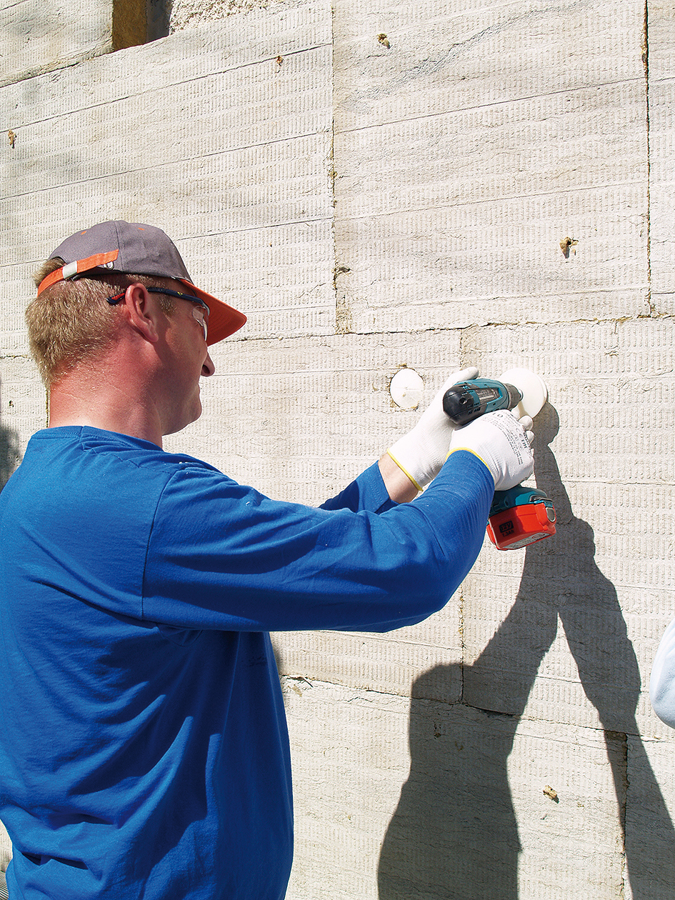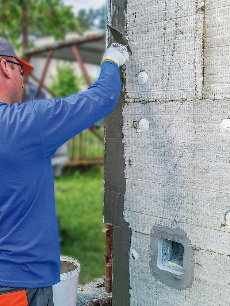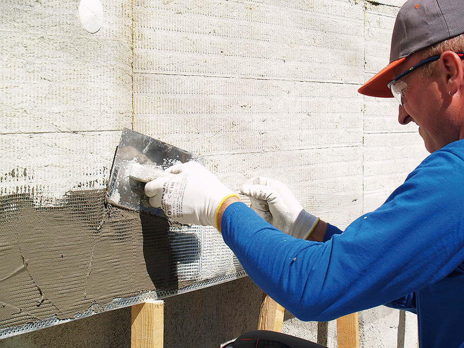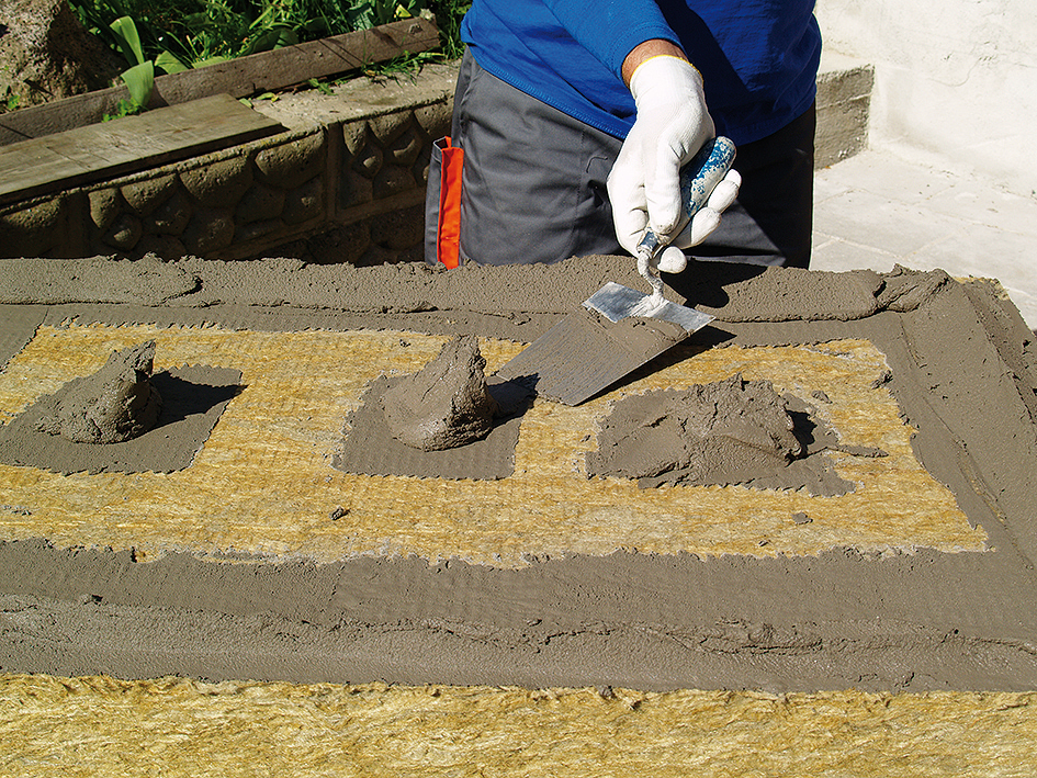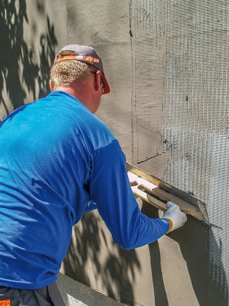 Oceľovým zubovým hladidlom sa nanesie na tepelnoizolačné dosky lepiaca a stierkovacia malta najneskôr 8 dní po ich nalepení. Do lepiacej malty sa vtláča sklotextilná mriežka vo zvislých pásoch zhora nadol s presahom 100 mm.