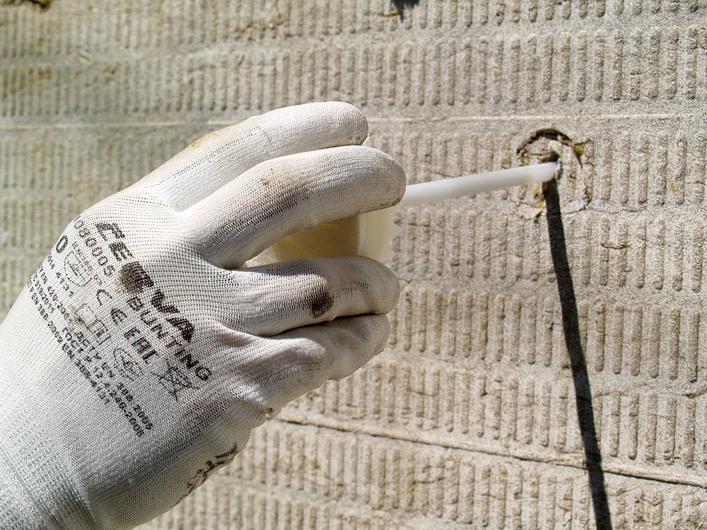 Otvory na osadenie kotiev sa vŕtajú kolmo na podklad. Pri tepelnoizolačných systémoch s tepelnou izoláciou na báze minerálnej vlny sa s vŕtaním začína až po prepichnutí tepelnoizolačnej dosky vrtákom. Priemer vrtáka sa stanoví podľa typu použitej kotvy určenej projektovou dokumentáciou. Do vysokoporéznych materiálov a materiálov s dutinami sa otvory vŕtajú bez príklepu. Otvor sa vyvŕta o 10 mm hlbšie, ako je predpísaná dĺžka kotvy. Najmenšia vzdialenosť odsadenia kotiev od rohov sa odporúča 10 mm. Taniere osadených kotiev nesmú narúšať rovnosť základnej vrstvy. Zle osadené, poškodené alebo deformované kotvy sa musia odstrániť a nahradiť novými, pričom sa osadzujú do nového otvoru, v blízkosti miesta osadenia odstránenej kotvy. Otvor po kotve sa vyplní lepiacou maltou. Ak sa nedá zle osadená alebo deformovaná kotva odstrániť, upraví sa tak, aby nenarúšala celistvosť a rovnosť ETICS.