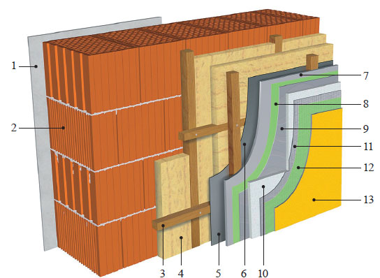 5 – paropriepustná fólia, 6 – vzduchová medzera, 7 – cementovláknité dosky, 8 – penetračný náter, 9 – lepiaca malta, 10 – tepelná izolácia (polystyrén), 11 – lepiaca malta s vystužujúcou mriežkou,