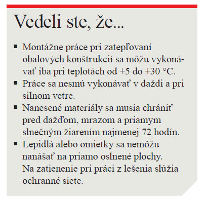 Ak už zatepľujete, trvajte na kvalite. Tým, ktorí nevedia odborne zhodnotiť kvalitu výrobkov a prác pri obnove budov, významne pomôže, ak budú od projektanta aj realizátora vyžadovať dodržiavanie príslušných tepelnotechnických noriem a využívanie certifikovaných tepelnoizolačných systémov ETICS. Tepelnoizolačné certifikované systémy, pri ktorých výrobca určil vyhotovenie a použitie, majú podľa platných európskych technických špecifikácií životnosť minimálne 25 rokov. Samozrejme, ak sú správne zvolené a zabudované do stavby. Priebežne kontrolovať dodržiavanie projektu, kvalitu vyhotovenia a použitých materiálov je úlohou stavebného dozoru. Ten však nie je na stavbe stále. Preto sa oplatí byť informovaný o pláne prác, a pritom sa dívať okolo seba, pýtať sa a žiadať odpovede. Ak máte pocit, že niečo nie je v poriadku, treba ihneď reagovať a poradiť sa so stavebným dozorom. Nedostatky, ktoré sa zistia včas, sa dajú ľahšie opraviť. Aj preto sa oplatí vedieť, z čoho sa skladajú jednotlivé systémy na zlepšenie tepelnotechnických vlastností a aké základné pravidlá je potrebné dodržať pri ich použití.