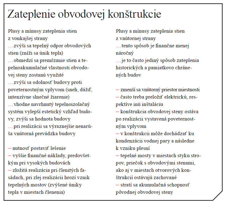 Ak v bytovom dome znížite tepelné straty, bude menšia aj spotreba tepla na vykurovanie. Ale to nie je jediný benefit dôslednej obnovy bytových domov. Zároveň lepšie využijete tepelnoakumulačné vlastnosti obvodových stien, vďaka čomu sa ustáli vnútorná klíma a spomalí ochladzovanie miestností pri prerušení vykurovania. Vďaka zvýšeniu vnútornej povrchovej teploty stien zabezpečíte tepelnú pohodu aj pri nižšej vnútornej teplote. Výhody si užijete aj v lete, keď sa obmedzí nepríjemné prehrievanie miestností pri vysokých teplotách. Obnovou v každom prípade zamedzíte poškodzovaniu samotnej konštrukcie obvodového plášťa, minimalizujete miesta s najväčším únikom tepla cez takzvané tepelné mosty a predídete zrážaniu vodných pár na vnútornom povrchu obvodových stien. Zabránite tak vzniku plesní v chladných rohoch miestností, samozrejme pri dostatočnom a pravidelnom vetraní. Navyše zamedzíte zatekaniu v stykoch obvodových stien a pri oknách, zvýšite odolnosť obvodových stien bytového domu proti poveternostným vplyvom a ochránite výstuže železobetónových a pórobetónových panelov pred koróziou. Vďaka precízne vykonaným opatreniam môžete predĺžiť pôvodnú technickú životnosť budovy aj o niekoľko desiatok rokov. A nezabúdajte, že v neposlednom rade dáte bytovému domu novú architektonické podobu a zhodnotíte ho.